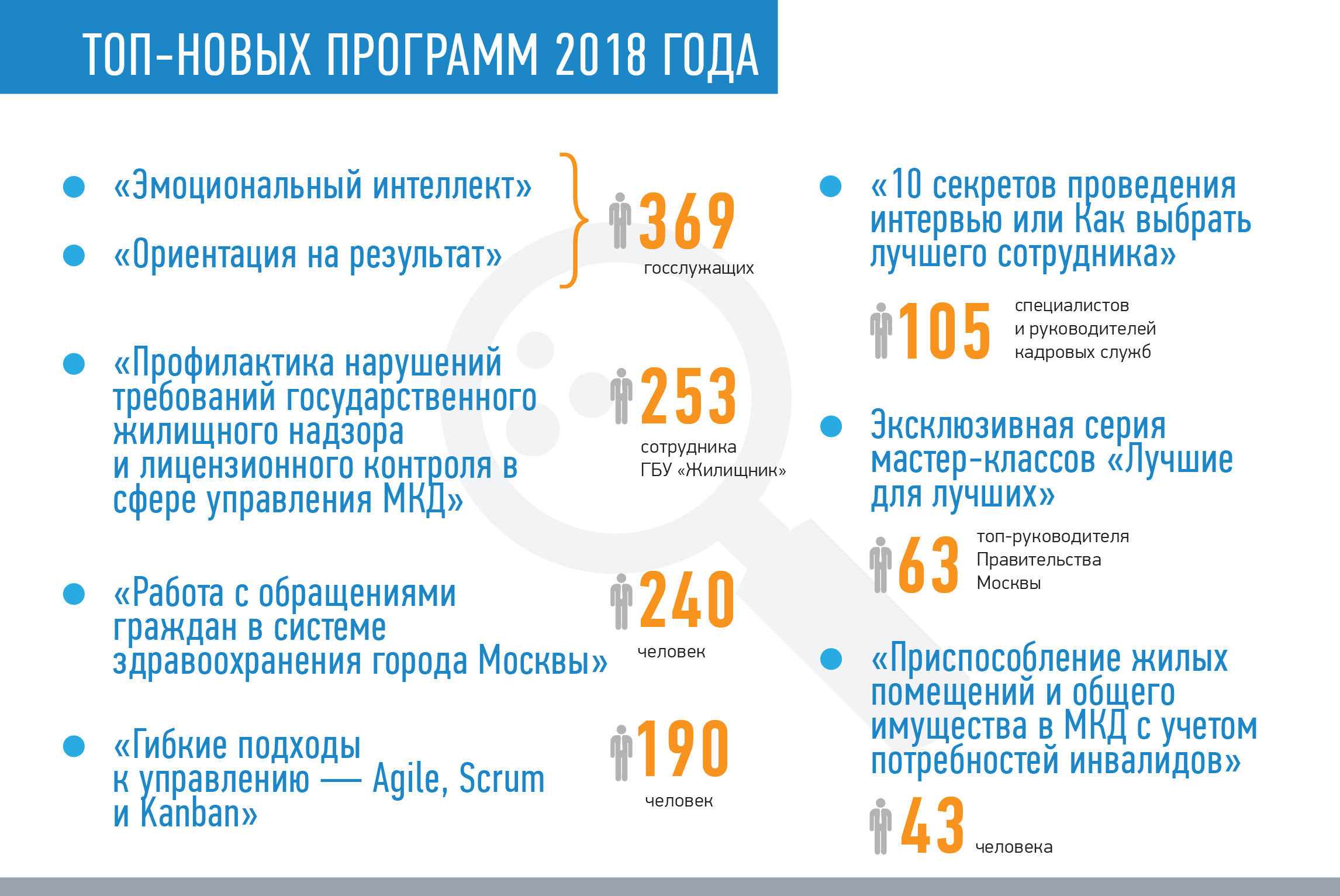 Одна из обсуждаемых тем 2018 года — реновация жилья в Москве. Это крупнейший проект, уникальный пример масштабного обновления городского пространства. Кто его должен курировать? Конечно же, отлично подготовленные специалисты. Для этого был разработан трехдневный семинар «Реализация Программы реновации жилищного фонда в г. Москве». Госслужащие и сотрудники бюджетных учреждений изучали правовые основы реализации программы, вопросы переселения жителей, узнавали о порядке проведения строительных работ и о том, как быть клиентоориентироваными в общении с москвичами.Обучение прошли 344 человека.