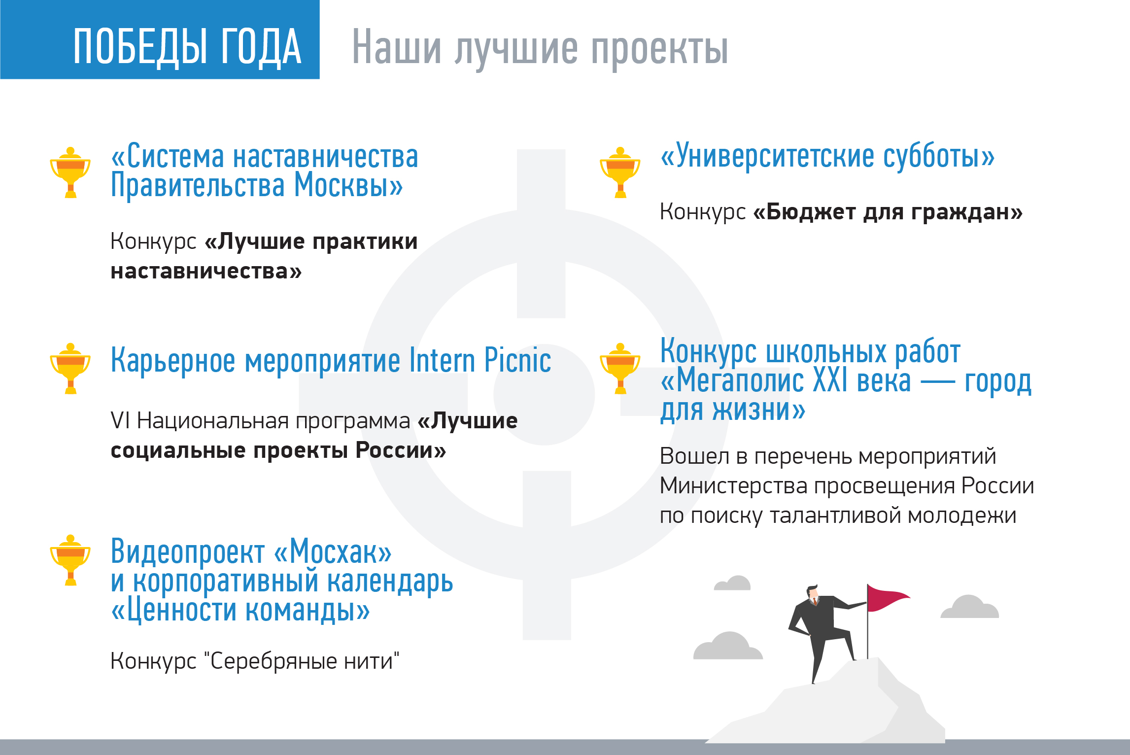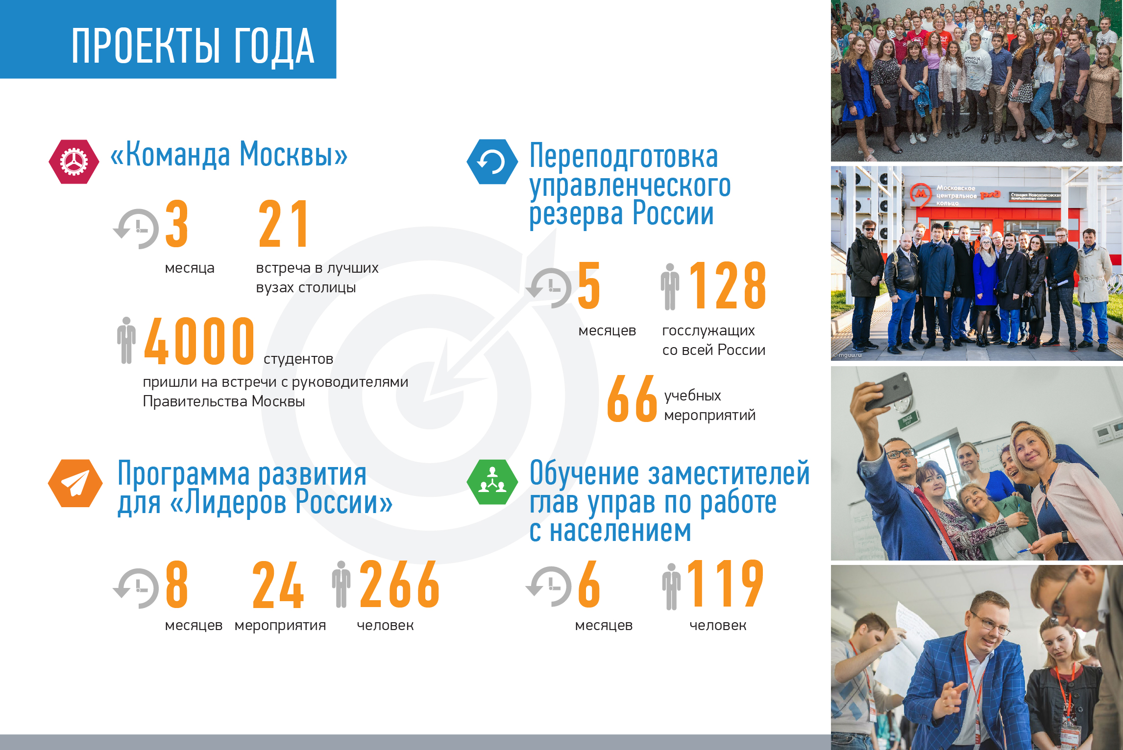 Самые яркие проекты, которые запомнились нам своей масштабностью и продолжительностью, — «Команда Москвы», программа развития для «Лидеров России», обучение заместителей глав управ столицы и госслужащих со всей страны по федеральной программе «Подготовка и переподготовка резерва управленческих кадров».