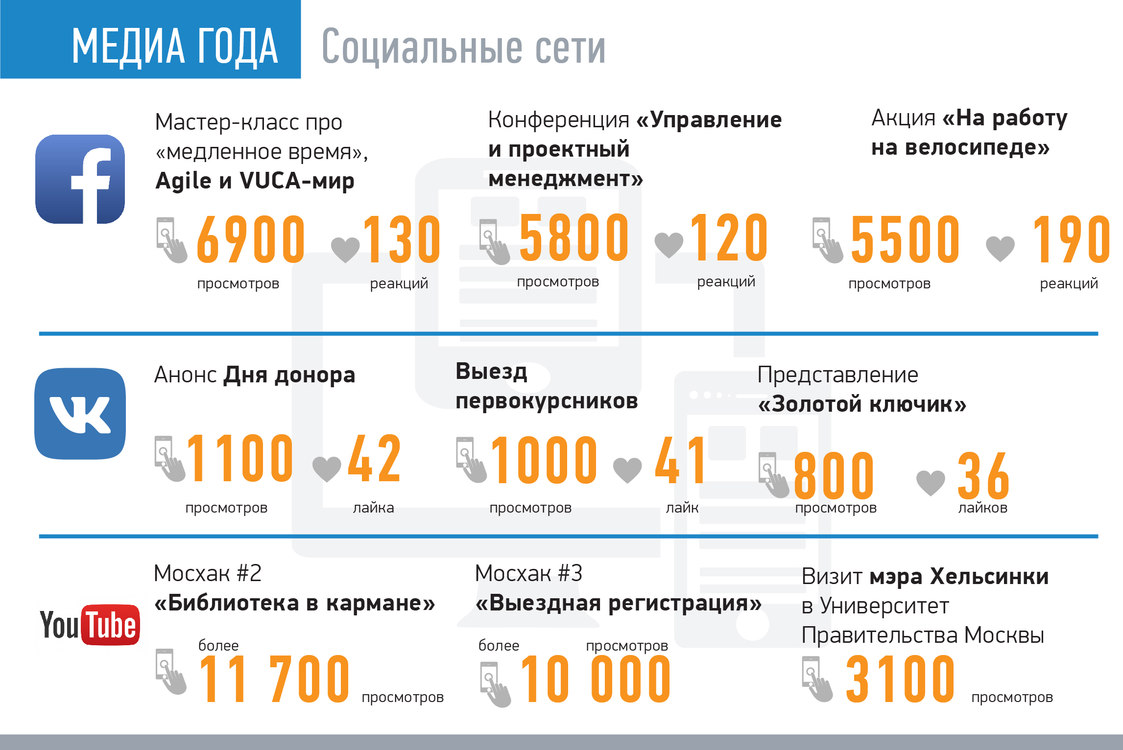 На странице в Facebook мы публикуем все наши новости. И самой популярной была тема про «медленное время», Agile и VUCA-мир. Об этом нашим слушателям рассказал бизнес-тренер Марк Кукушкин. Пост завоевал 6900 просмотров, 130 реакций. На втором месте — пост о конференции «Государственное управление и проектный менеджмент»: 5800 просмотров, 120 реакций. На третьем — новость про ректора Университета Правительства Москвы, который поддержал акцию «На работу на велосипеде»: 5500 просмотров, 190 реакций. Среди видеороликов больше всего просмотров в Facebook собрал «Мосхак#5: карта бесплатных туалетов» (11 000 просмотров).