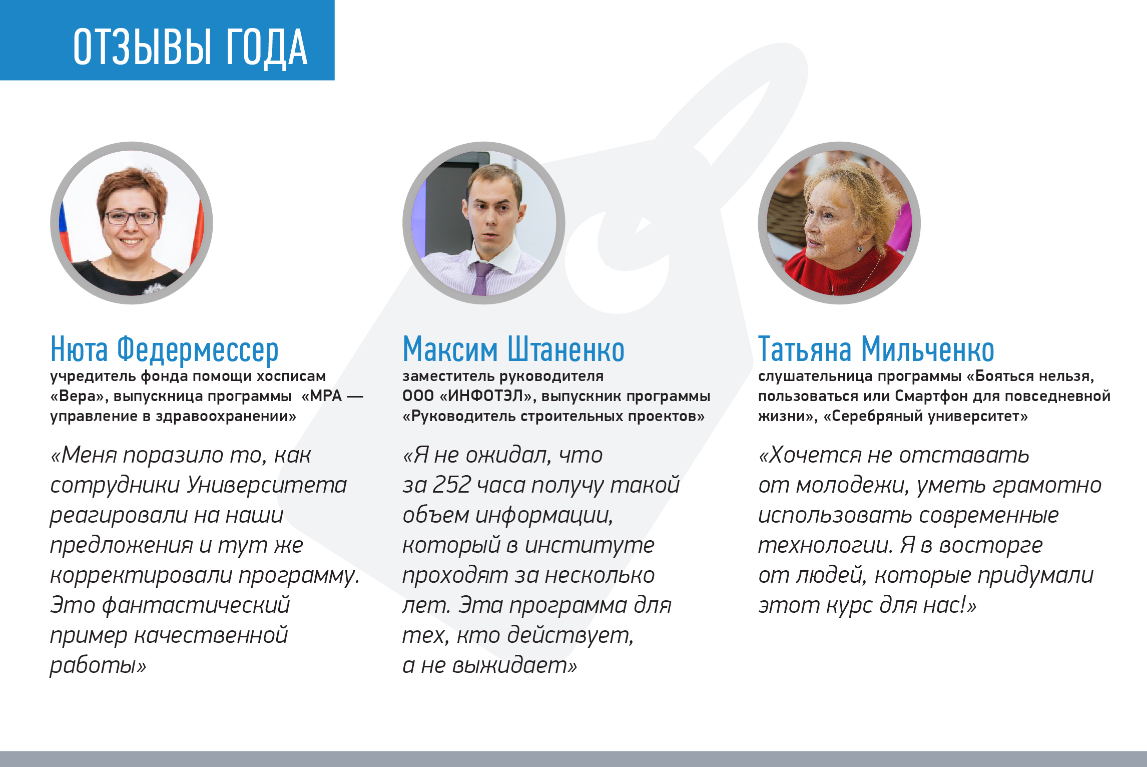 После каждого семинара, тренинга и мастер-класса мы получаем много отзывов от наших слушателей. Они у нас яркие, смелые, с большим желанием учиться и меняться. Представляем лишь некоторых из них.