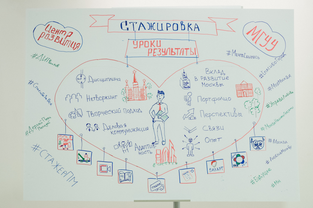 После экспресс-обучения перед ребятами стояла задача в командах создать скрайб-проект на темы, связанные с Москвой и стажировкой. Выпускники делились лайфхаками стажировки, своей активной жизнью вне рабочих будней и тем, как их изменил проект «Москва моими глазами». Одна из команд рассказала, в каких ключевых событиях города участвовали стажеры. Вот что говорили выпускники: