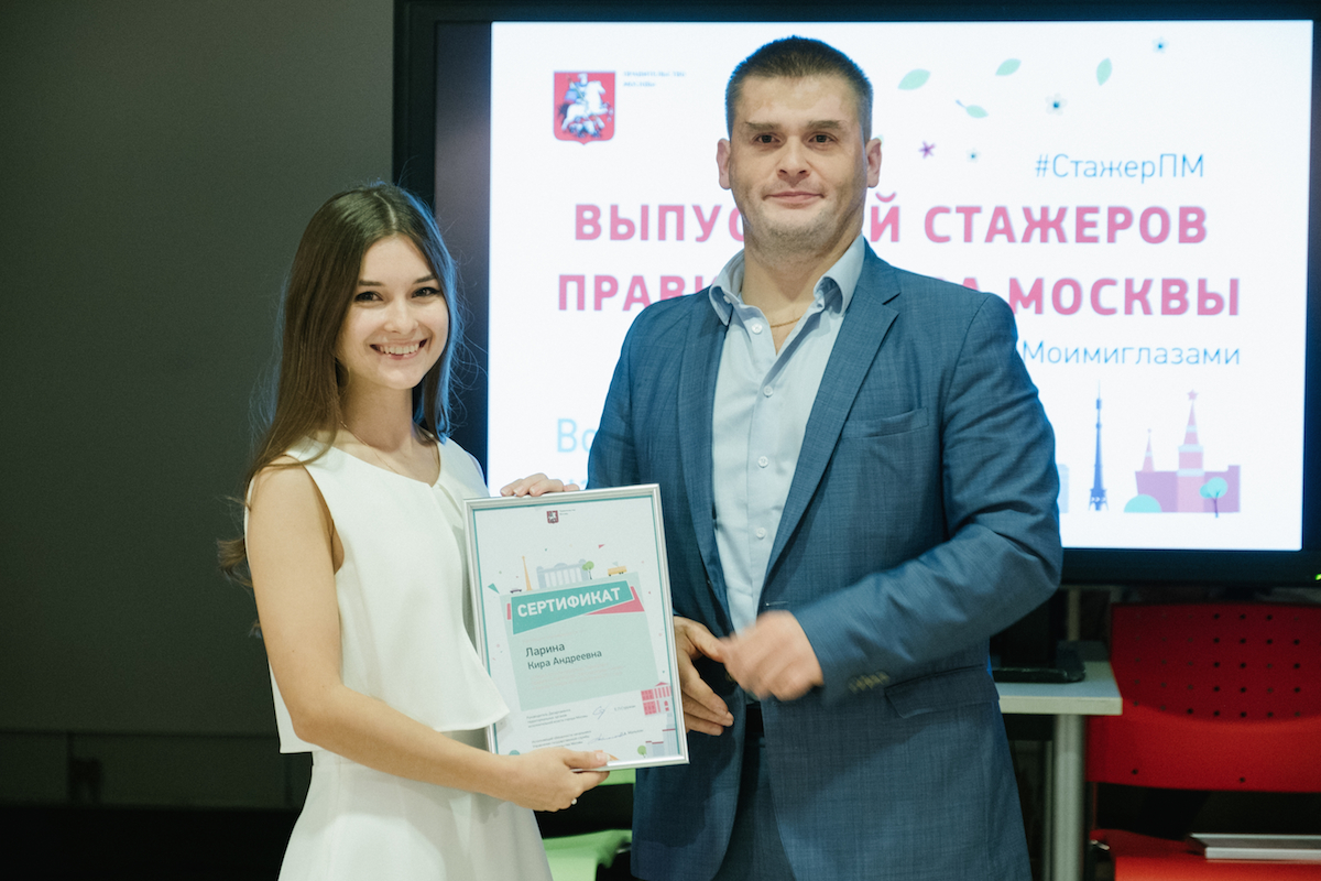 С окончанием стажировки ребят поздравили Павел Малыхин, исполняющий обязанности начальника Управления государственной службы и кадров Правительства Москвы, и Василий Фивейский, ректор Университета Правительства Москвы. Павел Малыхин похвалил стажеров за активное участие в жизни города и выразил свою надежду увидеть большинство ребят уже в качестве коллег. Василий Фивейский поделился своими эмоциями от выпускного: «Когда я сюда зашел, у меня возникли три версии того, что это за мероприятие. Я метался между заседанием Правительства Москвы, оперативкой мэра и финалом премьер-лиги КВН. Сложив все вместе, я получил подведение итогов стажировки Правительства Москвы. Я рад, что вы встали на правильный путь и учитесь увлекательно и с юмором рассказывать о серьезных вещах». Он также подчеркнул, что слоган программы стажировок «Москва моими глазами» означает, что для правительства Москвы очень важны взгляды нового поколения на управление городом. «Без молодежи многие проекты в Москве невозможны, в том числе потому, что вы многое по-другому видите. Старшее поколение видит иначе», — добавил ректор.