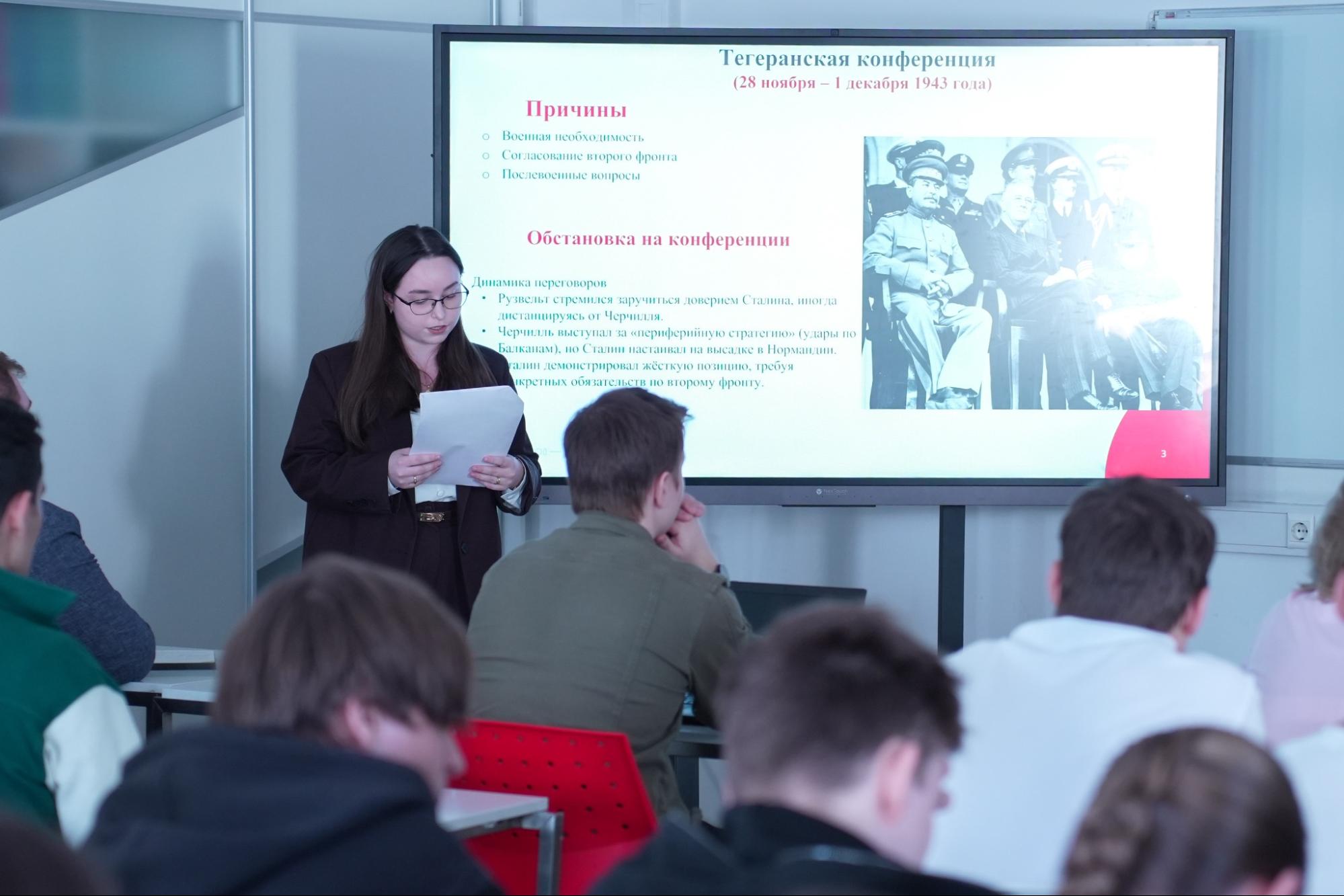 Выступление Ларисы Тиуновой, аспирантки первого курса направления «Менеджмент», вызвало оживленные дискуссии. Она рассказала о решениях Ялтинской встречи и их влиянии на новую мировую политическую систему.