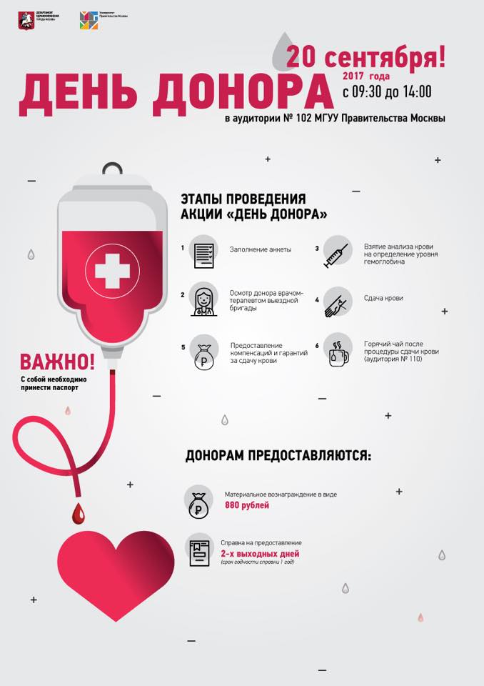 20 сентября в Университете Правительства Москвы будет работать пункт сдачи крови. Студентов и преподавателей, желающих сдать кровь и подарить тяжело больным людям шанс на выздоровление, ждут в 102 аудитории с 9:30 до 14:00. Донором может стать любой здоровый человек старше 18 лет.