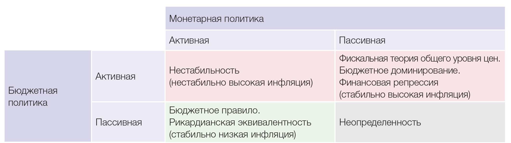 Бинарные сочетания бюджетной и монетарной политики предполагают выбор между устойчивостью государственных финансов и стабильностью инфляции.