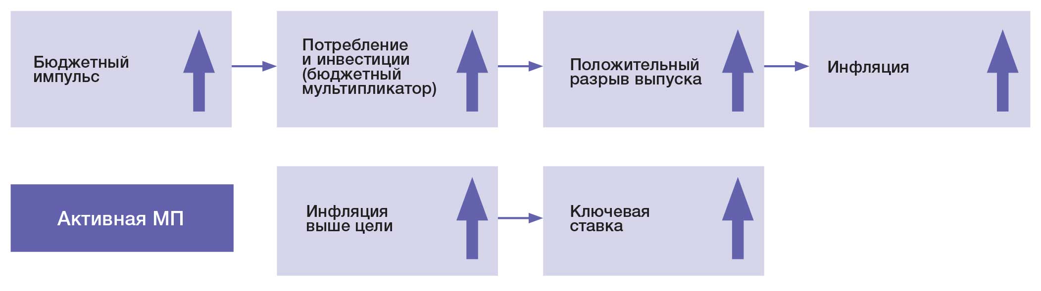 В рамках данной статьи предлагается рассмотреть взаимодействие бюджетной и налоговой политики на примере квартальной полуструктурной модели и описывается трансмиссия бюджетного импульса в случае сочетания активной бюджетной и активной монетарной политики (рис. 2).
