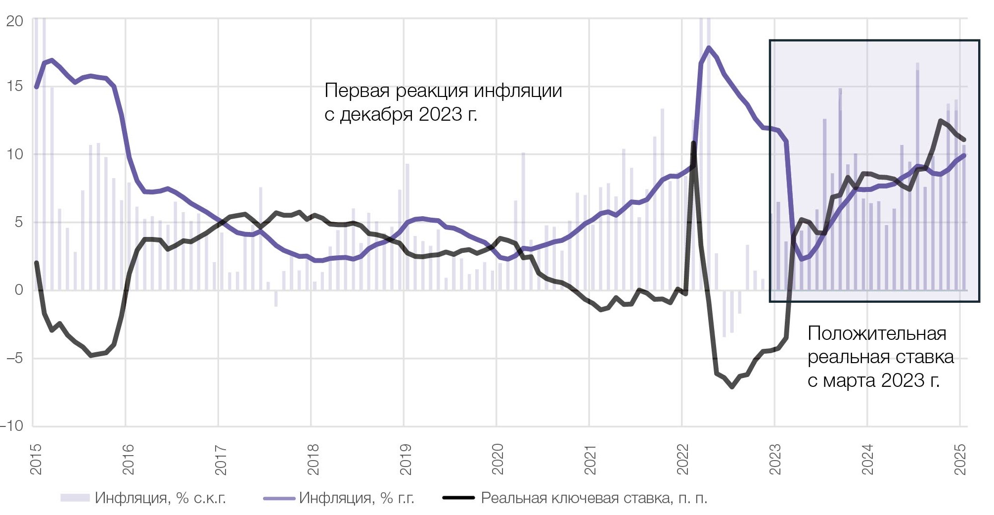 Рис. 4. Динамика инфляции и реальной ключевой ставки в России в 2015–2025 гг., % (источники: Росстат,