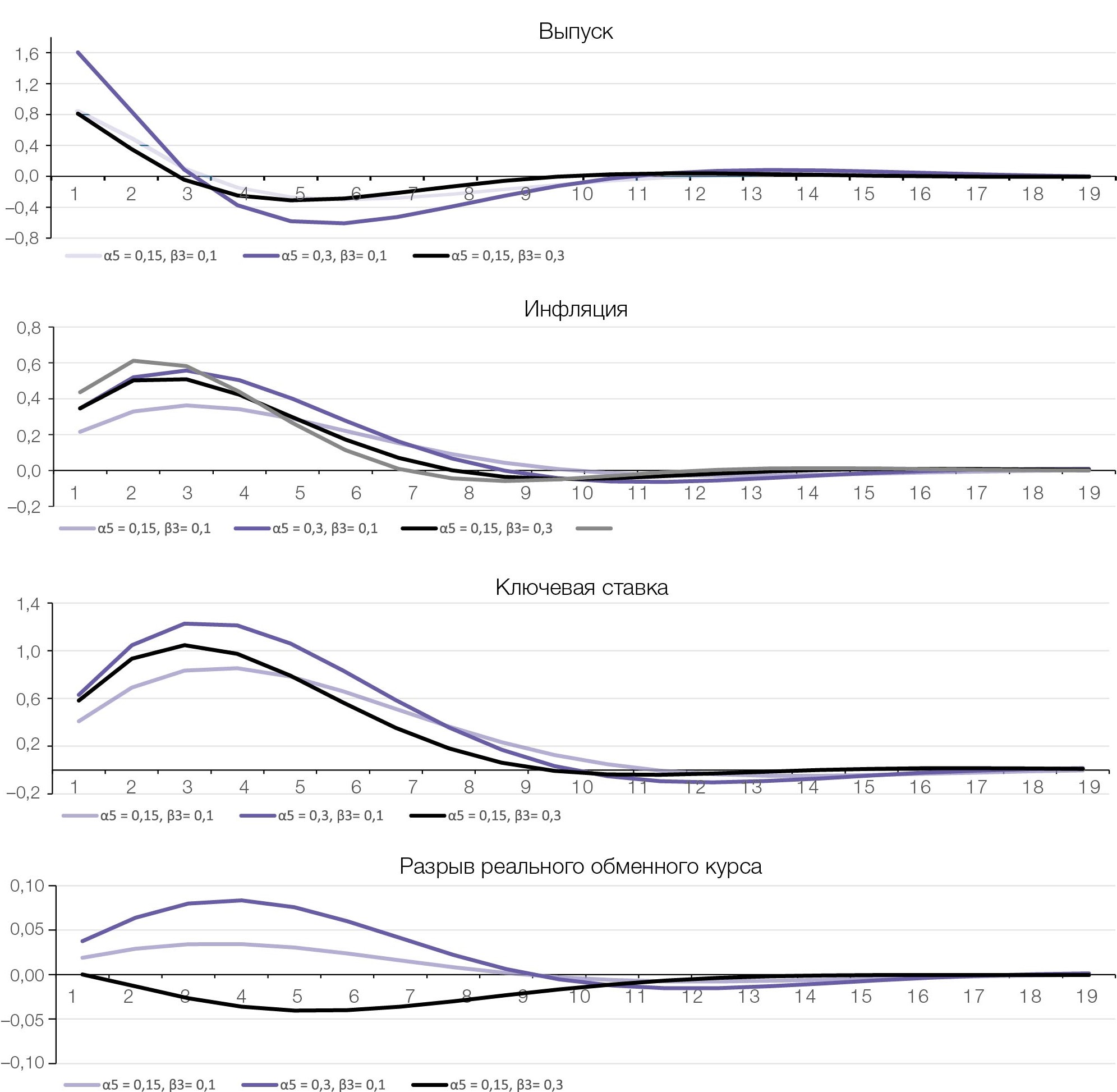 В качестве эксперимента проводилось изменение (с 0,1 до 0,3) параметра β3, характеризующего реакцию инфляции на разрыв выпуска. В данном сценарии она практически так же реагирует на шок бюджетного импульса: наблюдается более высокая степень реакции инфляции на то же значение разрыва выпуска и так же требуется более сильная реакция денежных властей в соответствии с правилом Тейлора. Вместе с тем происходит уменьшение реального обменного курса, что не соответствует экономической логике, и такая корректировка параметра приводит к неадекватной работе модели.
