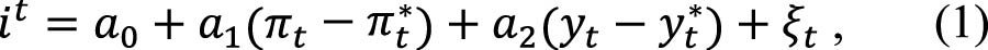 где it — номинальная процентная ставка Центрального банка (инструмент) в момент времени t, πt — текущий темп инфляции, πt* — желаемый темп инфляции в момент времени t, установленный Центральным банком, (yt – yt*) — отклонение фактического выпуска от потенциального уровня, ξt — шок монетарной политики в момент времени t. В терминах коэффициентов действия денежно-кредитной политики являются активными, если a1 > 1, т. е. выполняется правило Тейлора (Центральный банк изменяет процентную ставку в ответ на отклонение инфляции от целевого значения в соотношении большем, чем один к одному, либо равном). Если a1 < 1, то Центральный банк ведет себя пассивно в отношении изменения инфляции [7].