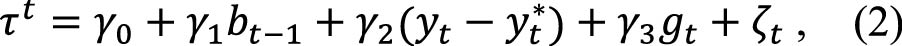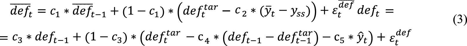 где τt — отношение налоговых доходов к ВВП в текущий момент времени, bt – 1 — значение государственного долга в предыдущий момент времени, (yt – yt*) — отклонение фактического выпуска от потенциального уровня, gt — отношение государственных закупок к ВВП, ζt — шок бюджетной политики в момент времени t. Фискальная политика характеризуется как активная, если γ1 ≤ 1. В ответ на возросшее в прошлый момент времени значение государственного долга правительство не изменяет или даже уменьшает долю налоговых сборов в ВВП. Если же γ1 > 1, то это означает, что правительство заботится о стабилизации государственного долга и увеличивает налоги (сокращает бюджетный дефицит) в ответ на возросшее в прошлый момент времени значение государственного долга [7].
