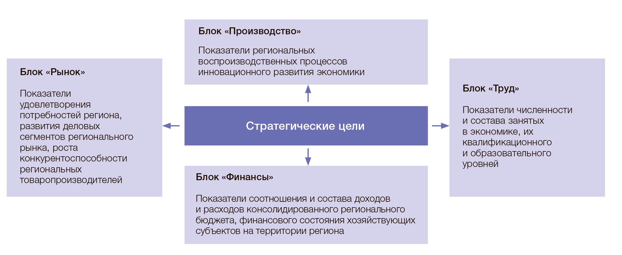 В работе Е. В. Заровой и Р. А. Проживина [5] предлагается следующая модель системы сбалансированных показателей развития региона на основе данных региональной статистики (рис. 1). Составляющая внутренних процессов для уровня региона обозначена как «производство», уровень сбыта и маркетинга определен как «рынок», уровень обучения и развития — «труд». Уровень финансов, по своему наименованию, остается неизменным. Данная модель представляет существенный интерес с точки зрения дальнейшего развития. С одной стороны, снижается внимание к субъекту управления, присутствующему в классической модели, — в данной модели перечисленные уровни характеризуют регион, т. е. объект, а не субъект управления. С другой стороны, примечательно, что появляется возможность в дальнейшем построить двухуровневую модель, использующую иерархическую систему сбалансированных показателей, что будет лучше отражать специфику управления регионом.