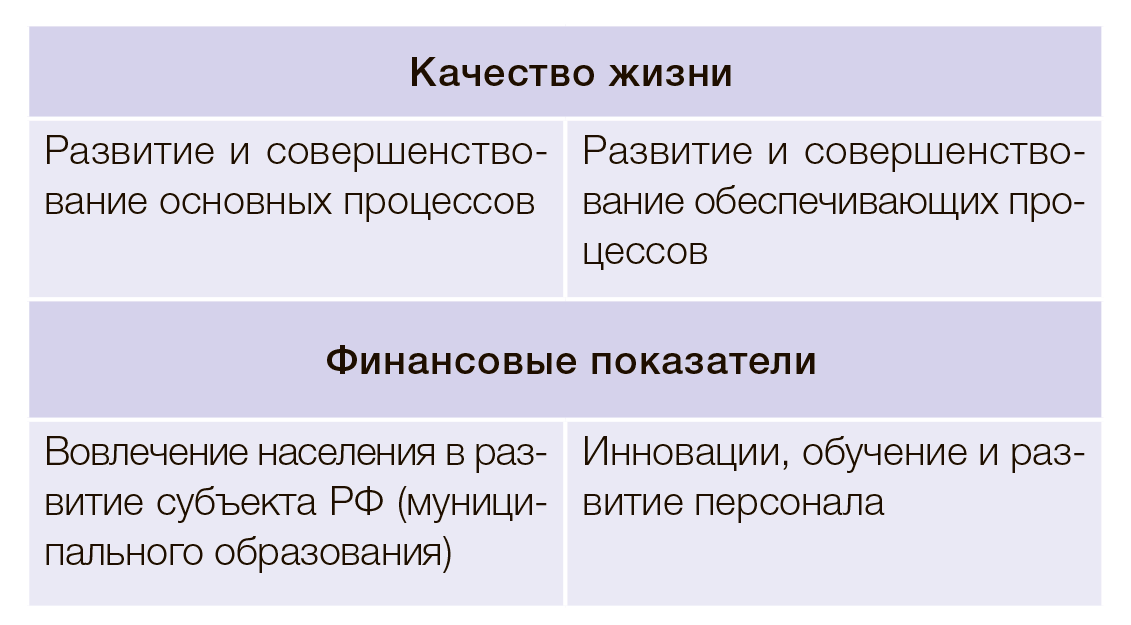 Обобщая рассмотренные исследования и наработки, попробуем сформировать структуру модели системы сбалансированных показателей для муниципальных образований. Воспользуемся принципом «бритвы Оккама» и не будем добавлять в классическую модель дополнительные элементы. Для начала необходимо расположить имеющиеся уровни в правильной последовательности, отвечающей приоритетности целеполагания с учетом специфики. Интересы людей, населения, безусловно, являются приоритетом в системе государственного и муниципального управления. Однако определять этот уровень как «Клиенты» представляется некорректным, а как «Социальная составляющая» [14] — слишком размыто. Можно определить данный уровень целей как «Качество жизни» — это огромный, многофакторный смысловой массив, с одной стороны, обеспечивающий возможность формировать цели нижестоящих уровней, а с другой стороны, определяющий верхнеуровневые цели развития муниципального образования. Учитывая опыт проведенных ранее исследований [5], имеет смысл с учетом специфики государственного и муниципального управления некоторые из уровней разделить на две части, поскольку возникает двойственность целеполагания для субъекта и объекта управления.
