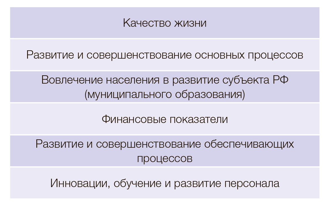 Уровень «Качество жизни» делить на части нецелесообразно. Уровень развития и совершенствования процессов необходимо разделить на «Развитие и совершенствование основных процессов», направленных непосредственно на достижение целей, стоящих перед органом государственного или муниципального управления в плане повышения качества жизни, и на «Развитие и совершенствование обеспечивающих процессов», направленных на привлечение ресурсов, обеспечение взаимодействия между участниками и другие действия, носящие обеспечивающий характер. Уровень финансовых показателей (финансовой политики) остается единым. Наконец, уровень «Обучение и развитие персонала» предлагается разделить на два подуровня. Первый — «Инновации, обучение и развитие персонала», объединяющий внутренние цели органа государственного или муниципального управления по развитию персонала, а также разработку и освоение инновационных методов и инструментов реализации функций (например, в области цифровизации). Второй — «Вовлечение населения в развитие субъекта Российской Федерации (муниципального образования)». В итоге получается структура, показанная на рисунке 2.