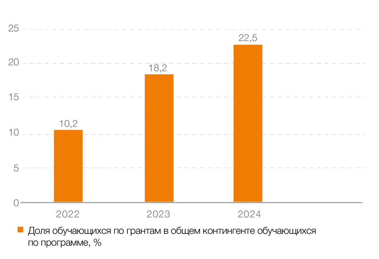 Размеры гранта соответствуют стоимости обучения, а средства выделяются из городского бюджета в форме субсидий. Доля грантов в общем объеме мест на образовательной программе, меняющаяся от года к году (рис. 1), говорит о росте востребованности нового подхода. C 2022 по 2024 г. доля тех, кто обучается по грантам, в общем контингенте обучающихся по программе увеличилась более чем в два раза – с 10,2 до 22,5%.